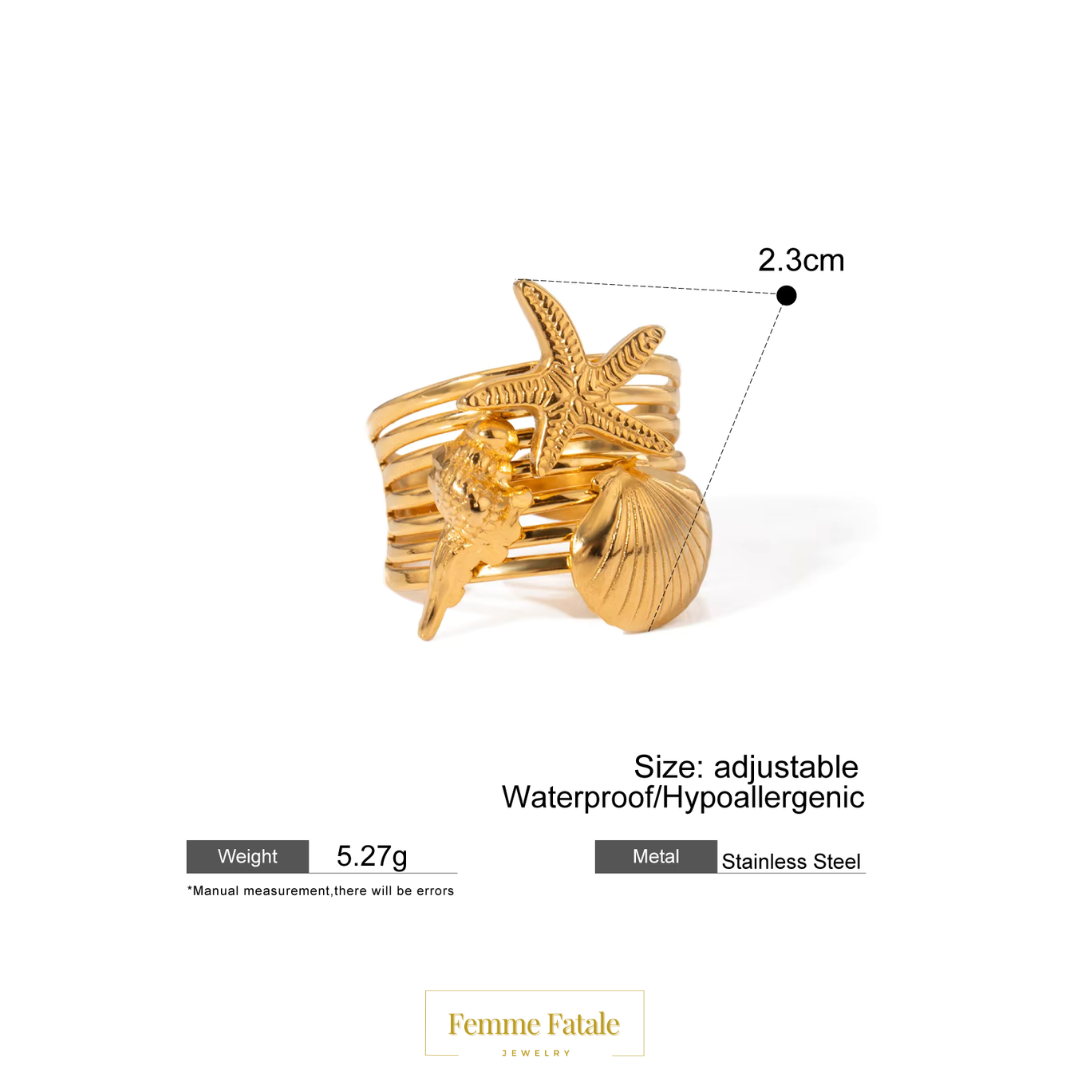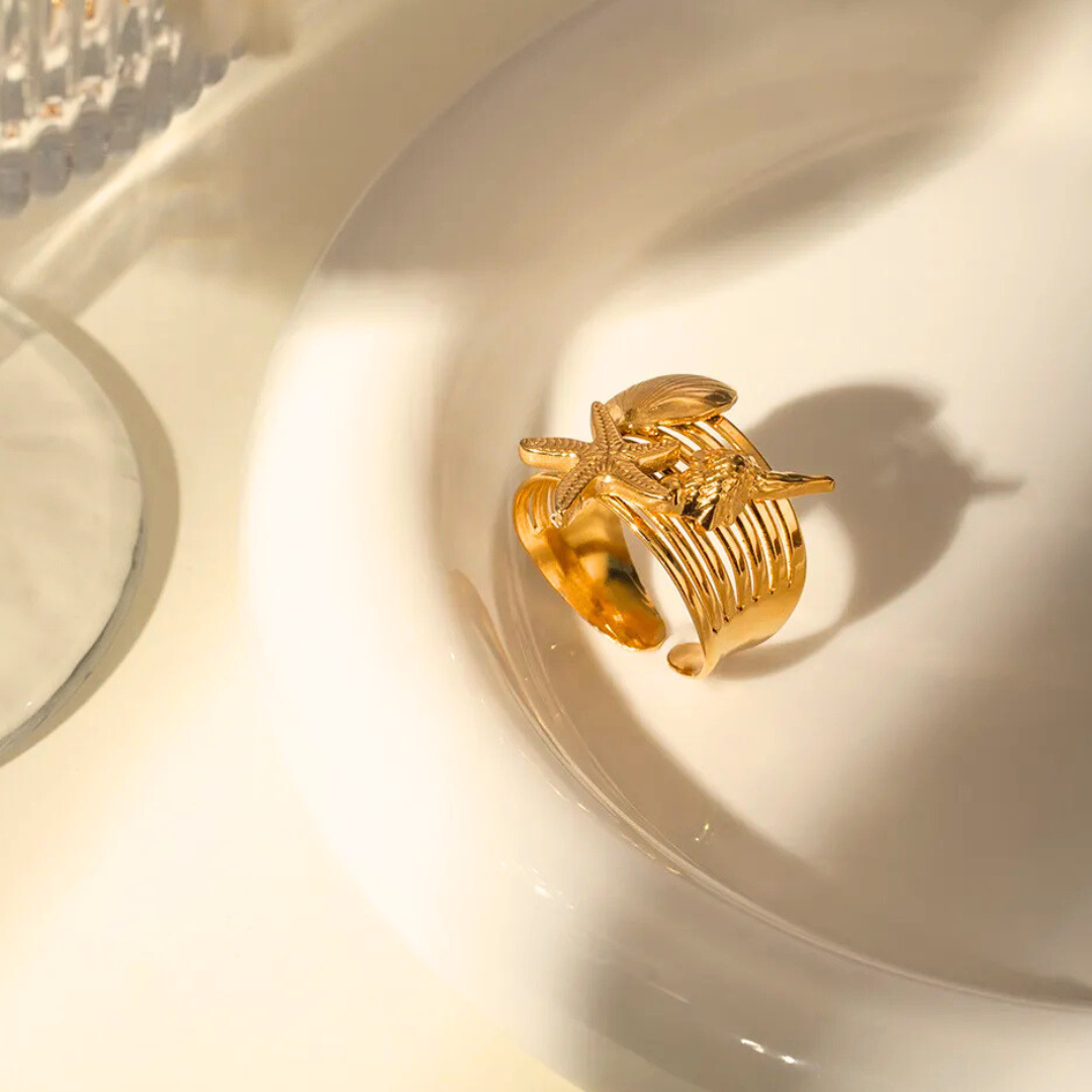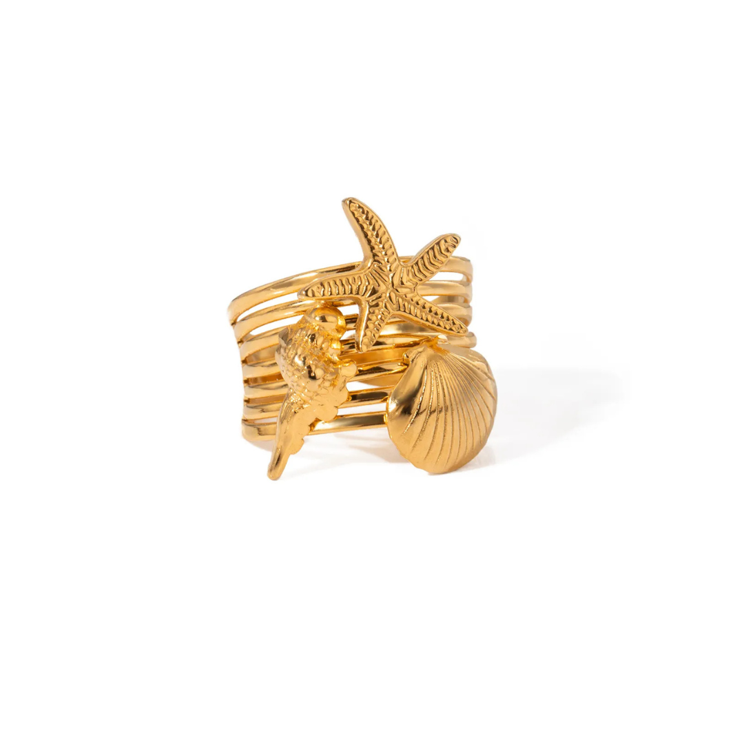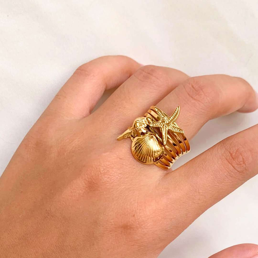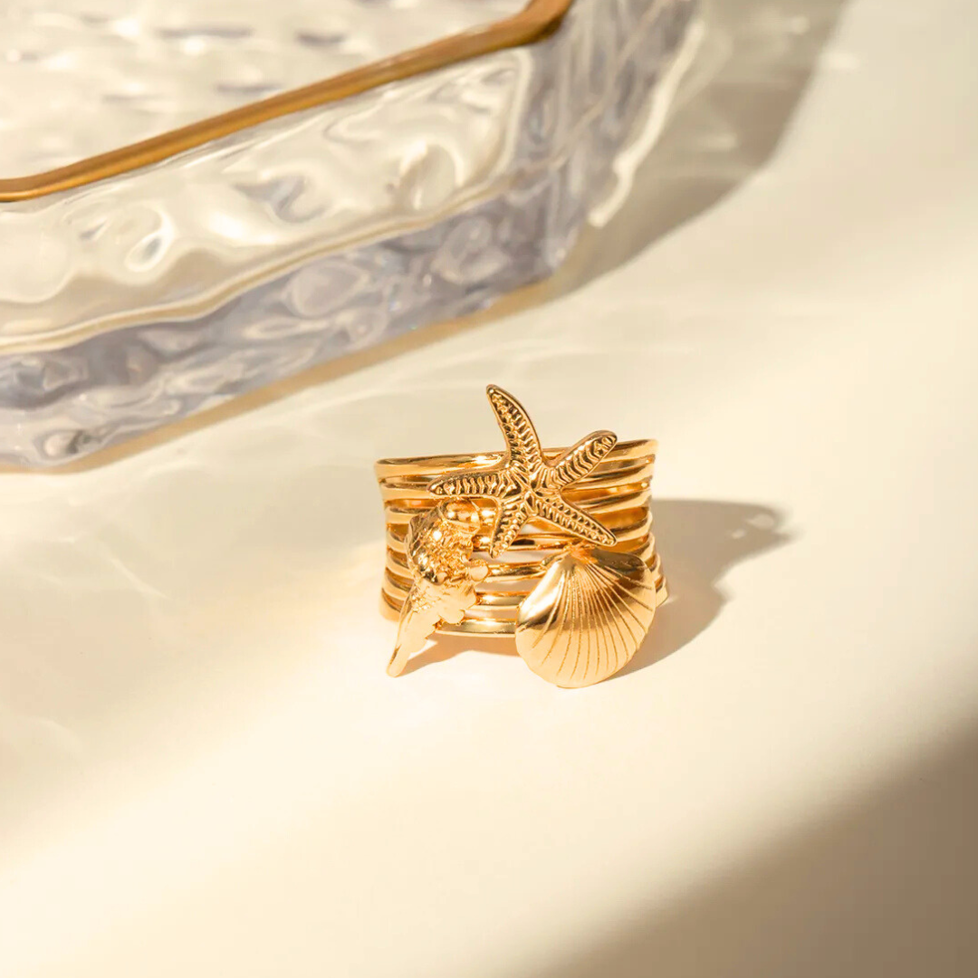A full ocean story wrapped around your finger — featuring a starfish, shell, and conch on a multi-band design.