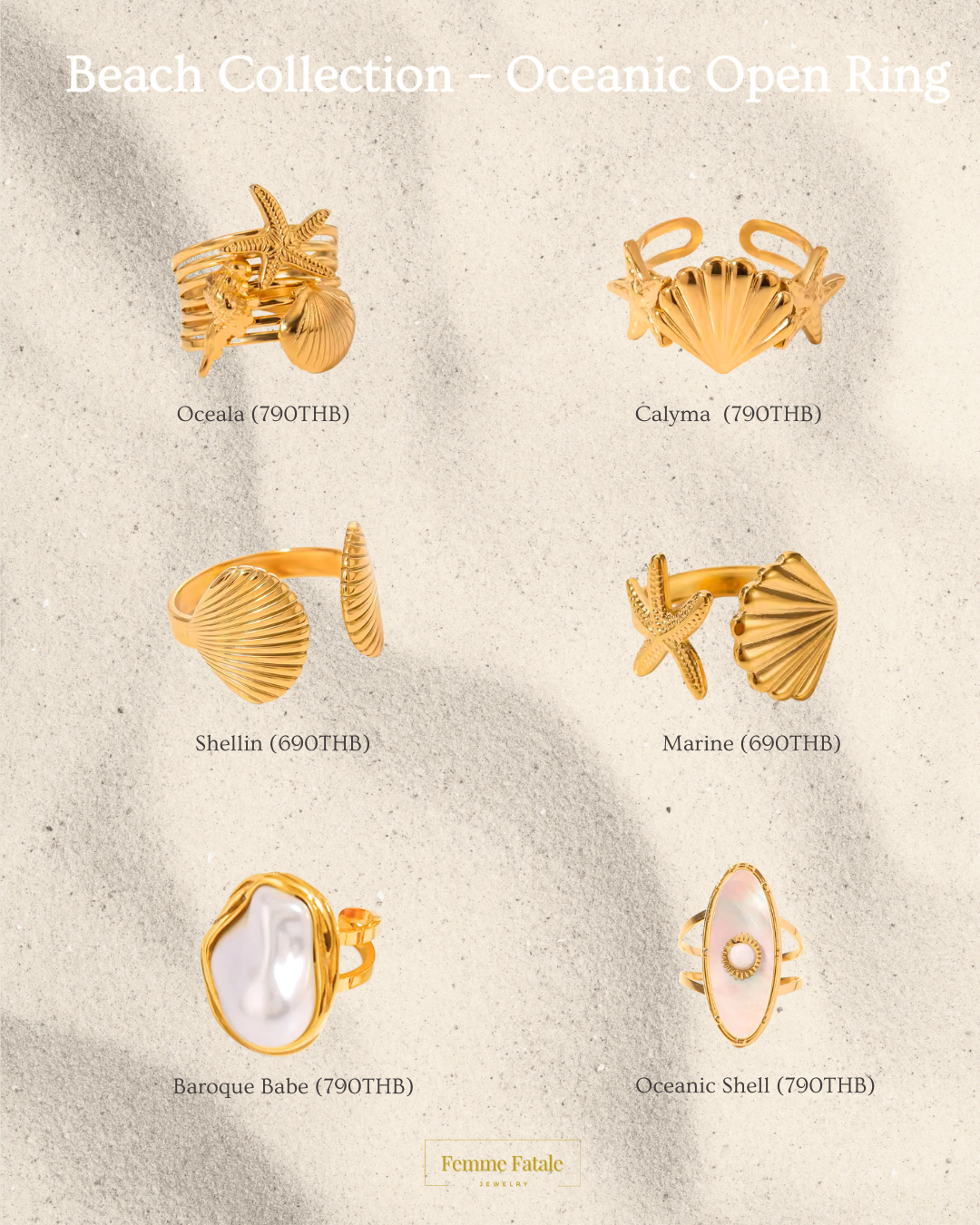 Dive into effortless elegance with the Oceanic Open Ring series — where coastal treasures meet modern design. Each ring is crafted in 18k gold plated stainless steel, making them water-friendly, tarnish-resistant, and lightweight. From pearls and starfish to sculpted shells, these open rings wrap your fingers in golden ocean energy. Adjustable for all-day comfort and stackable style.