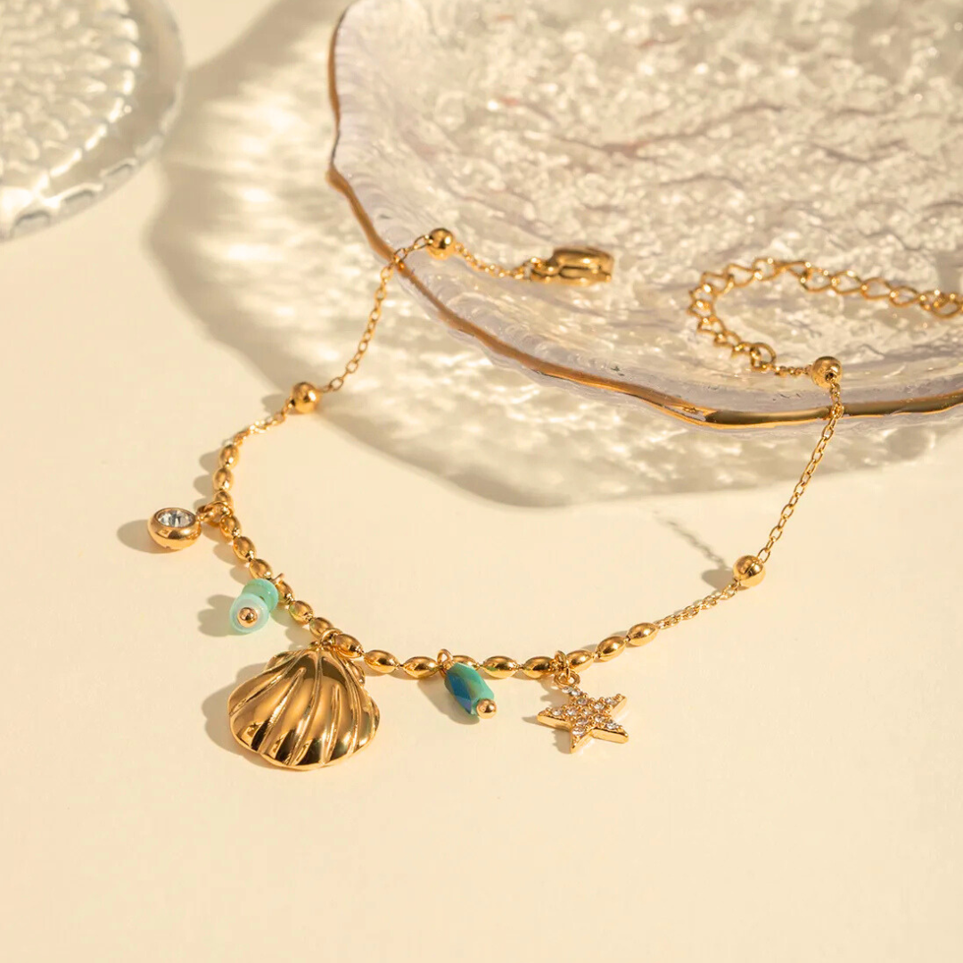Playful and poetic, Coriselle combines turquoise-inspired stones, a tiny starfish, and a golden shell — like collecting treasures from tidepools.